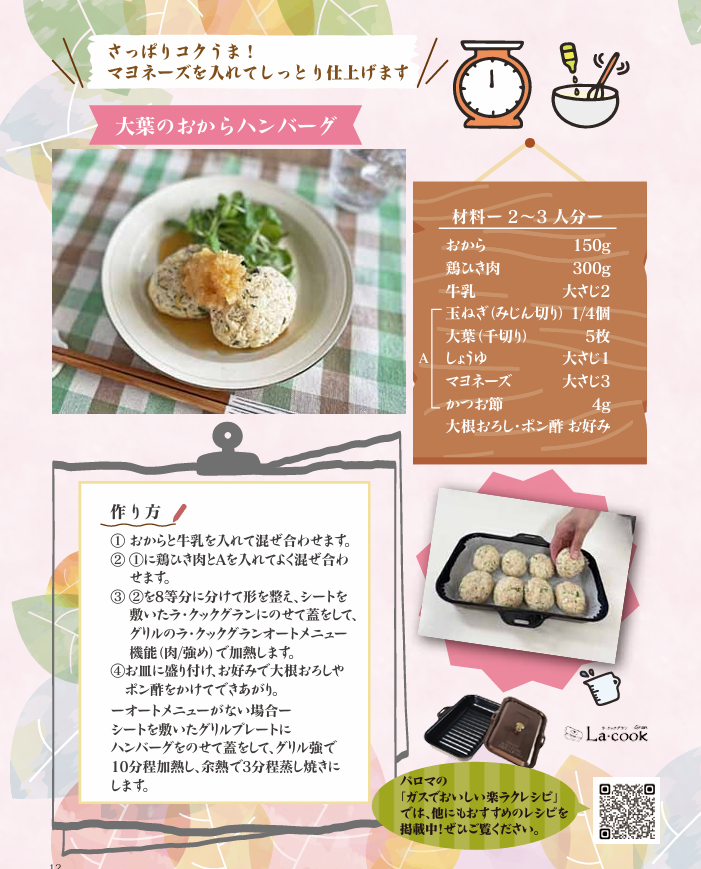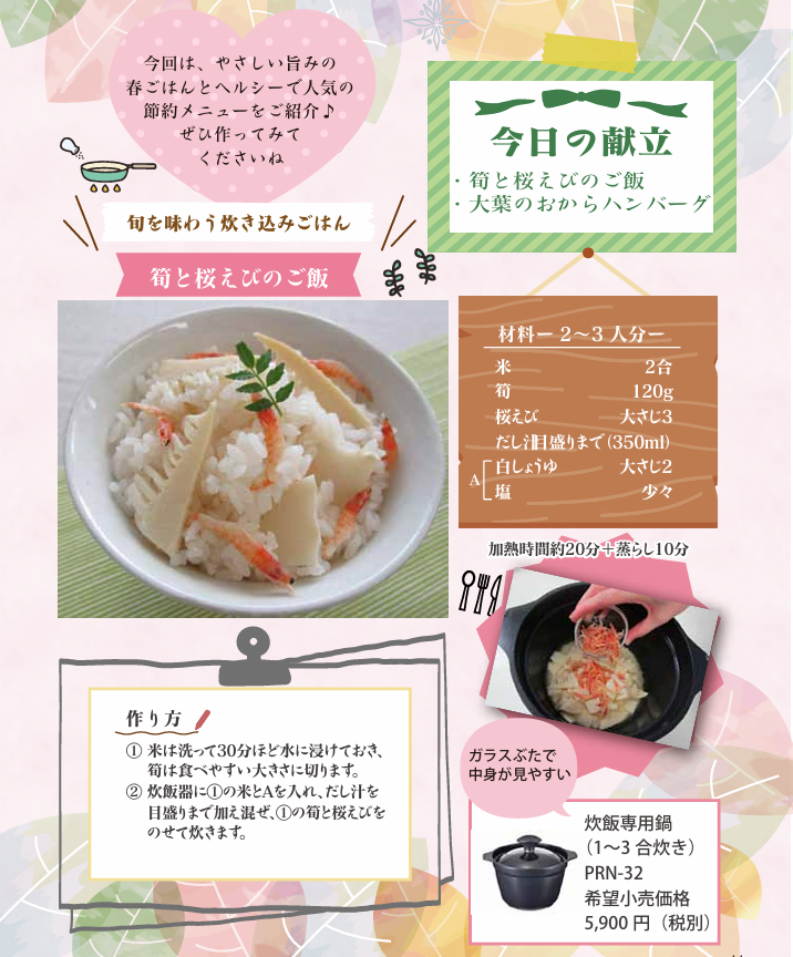 旬の食材を使った「筍と桜えびの炊き込みご飯」と、ヘルシーでやさしい味わいの「大葉のおからハンバーグ」をご紹介しております。